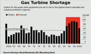 Diese Gaskraftwerke können niemals in den nächsten 5 Jahren gebaut werden. Es gibt weltweit im wesentlichen drei Hersteller von Gasturbinen: Siemens Energy (24 % Marktanteil), GE Vernova (25 %) und Mitsubishi (22%), die über 70 % des Marktes bedienen. Diese Hersteller sind bis zum Jahre 2030 vollständig ausgebucht. Die notwendigen deutschen 70 Gaskraftwerke sind daher in der Planung der Gasturbinenhersteller (s.u. Quelle Bloomberg ) noch nicht enthalten.