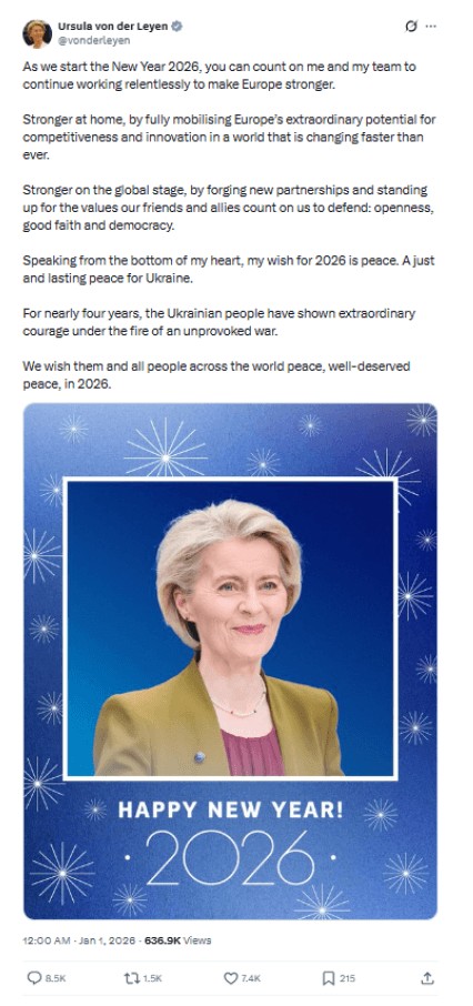 In der Regel freut man sich über Neujahrsgrüße, wenn auch nicht über alle. Einen Neujahrsgruß der besonderen Art kann man auf X bewundern: Ursula von der Leyen, die Präsidentin der Europäischen Kommission, die ihr Amt seit geraumer Zeit mit dem der Kaiserin von Europa verwechselt, hat ihre Untertanen mit einem freundlichen Gruß zum neuen Jahr 2026 bedacht.
